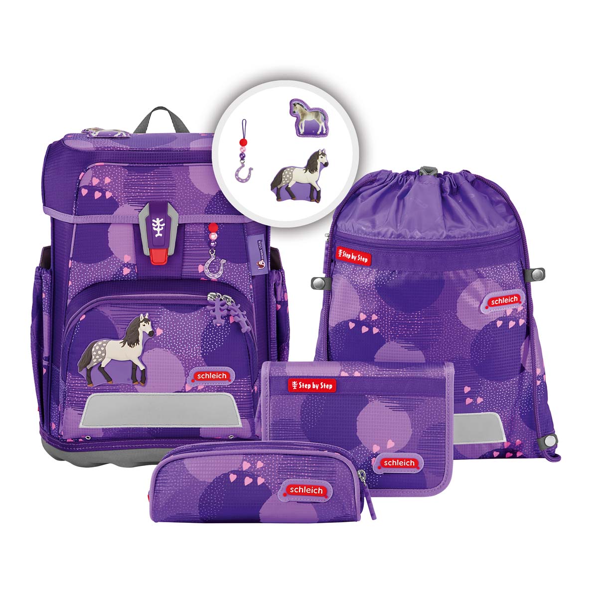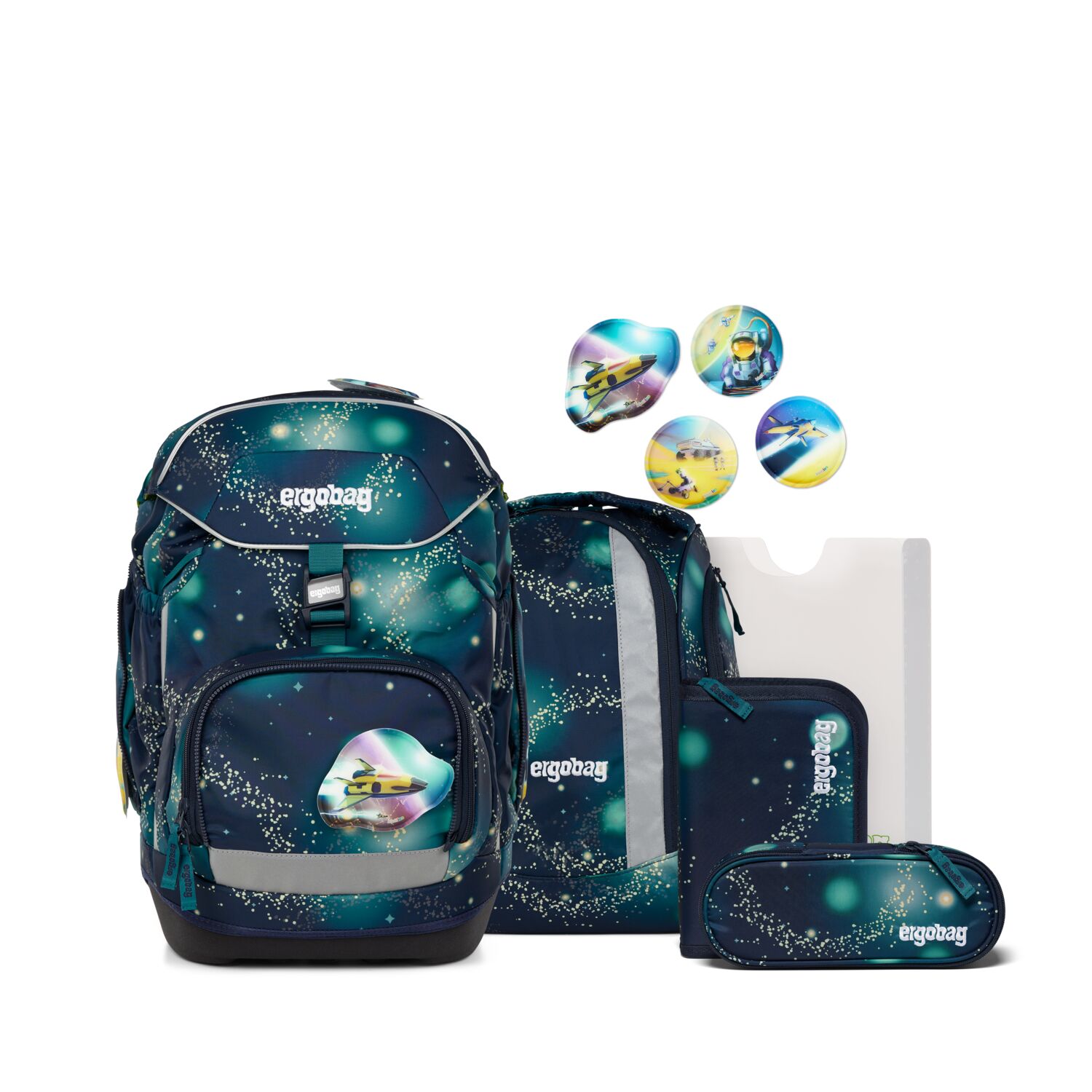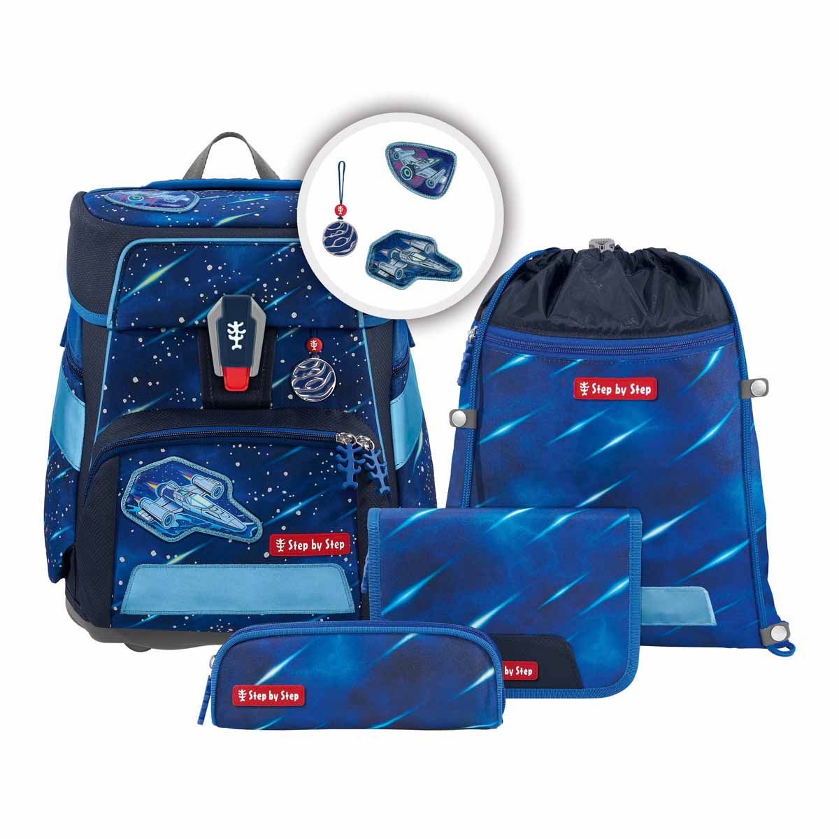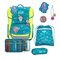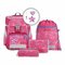 6-teiliges Set mit Schulrucksack, Heftebox, Sportrucksack, Federmäppchen, Schlamperrolle und Klettie-Set (5-tlg.).