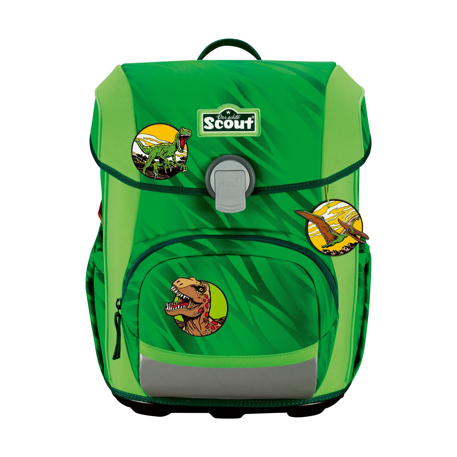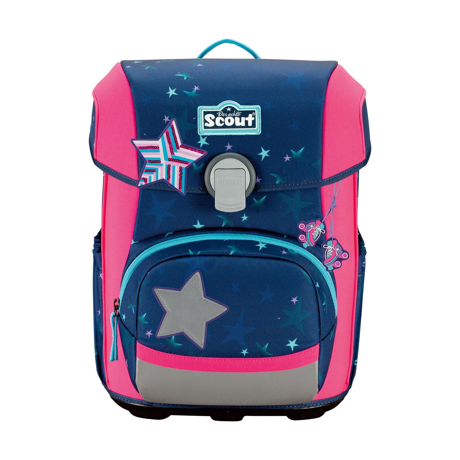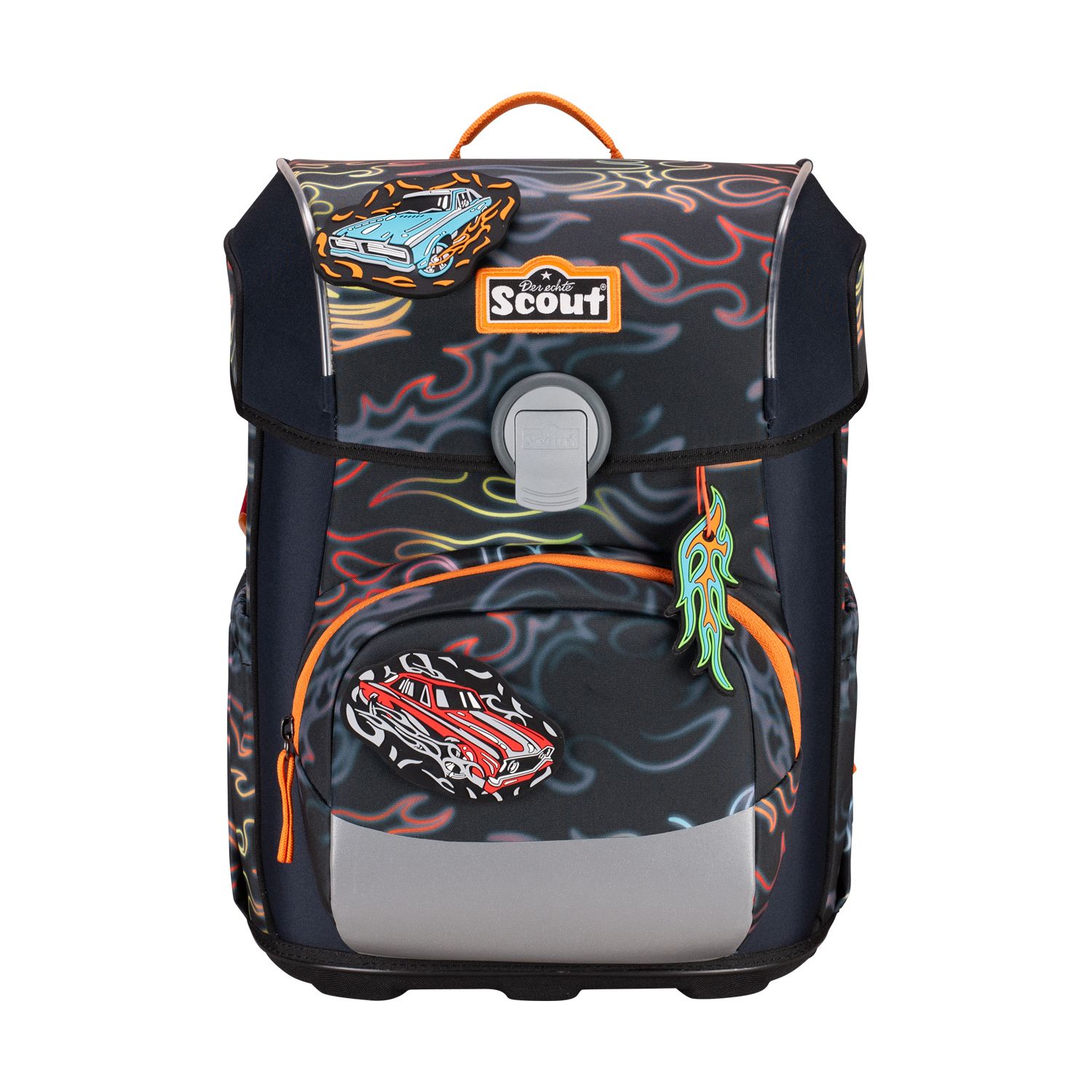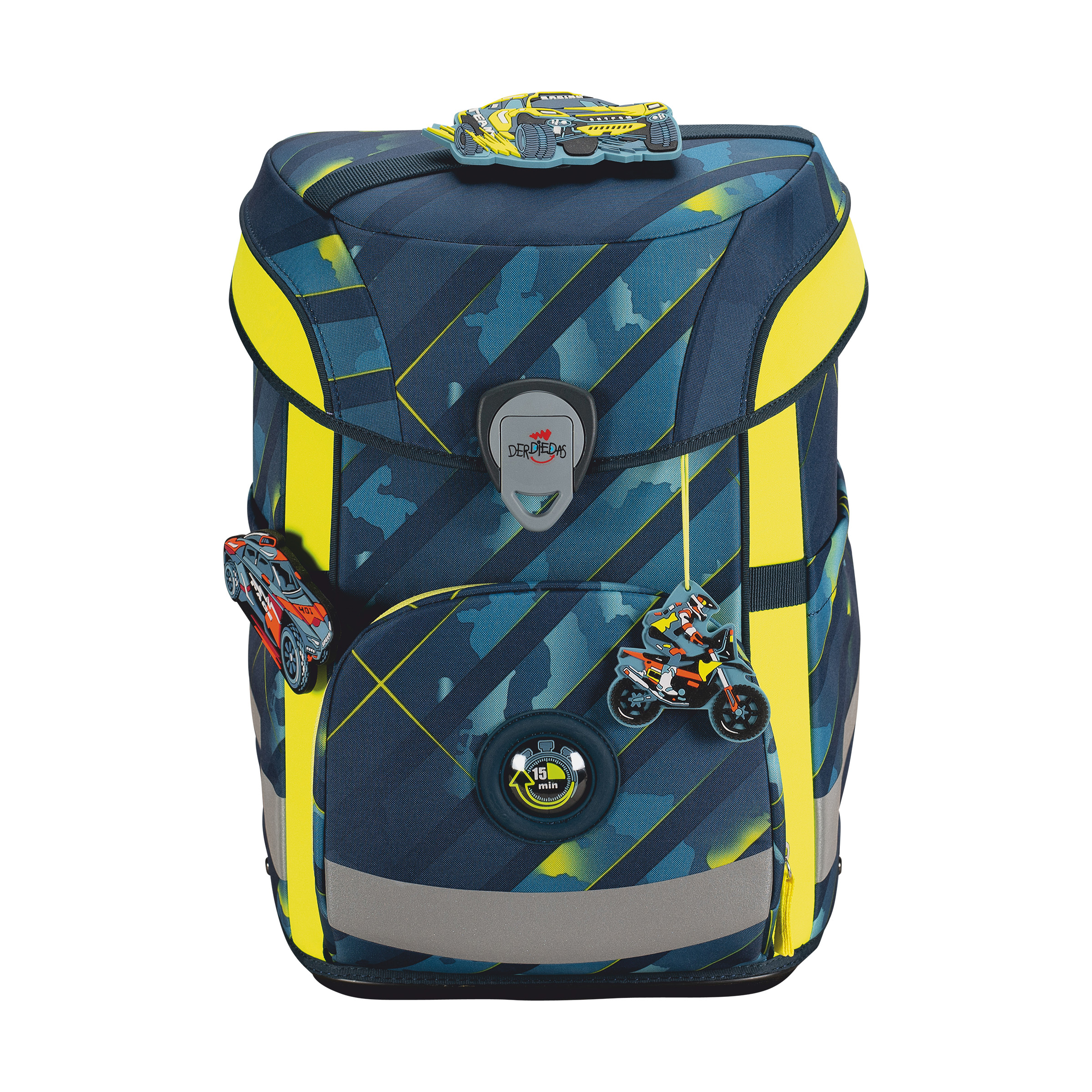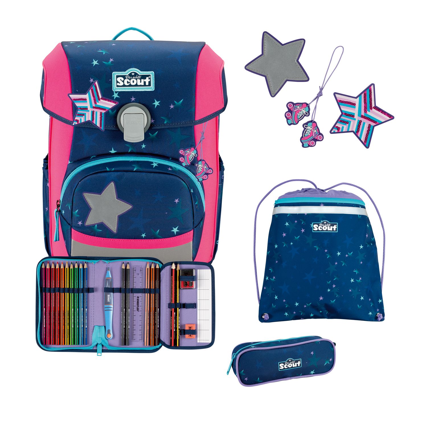 Der smarte Allrounder. Durchdachte Konstruktion mit schlanker Form. Flacher Deckel für viel Bewegungsfreiheit. Große Vordertasche für jede Menge Stauraum. Geräumige, dehnbare Seitentaschen. Auf dem Weg zur Schule ist Sicherheit das A und O. Farbenfrohe Designs ziehen bei Tageslicht die Blicke auf sich. Dank retroreflektierender und fluoreszierender Flächen nach DIN-Norm 58124 sind Schulkinder aber auch in der Dämmerung und bei Dunkelheit kaum zu übersehen.Maße:ca. 30 x 38 x 27 cm, Gewicht:ca. 1250 Gramm, Volumen:ca. 21,5 Liter Volumen, Schulranzen-Set 4-teilig bestehend aus: Schulranzen, Sportbeutel, Federmäppchen mit Staedtler Qualitätsbuntstiften, Schlamperetui.