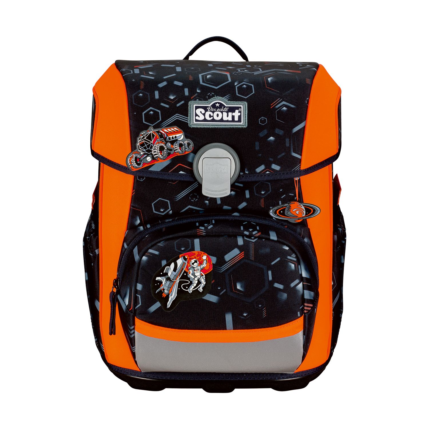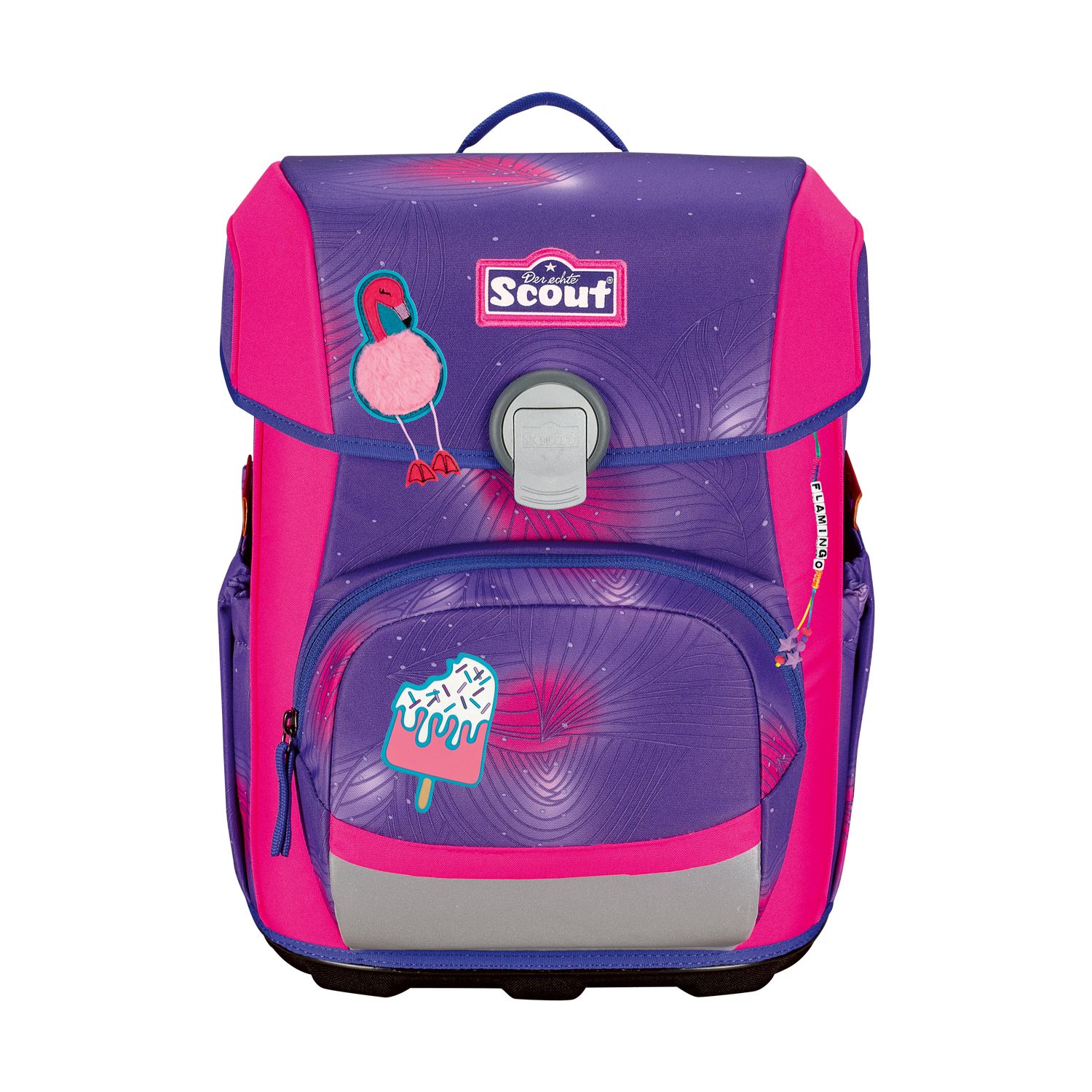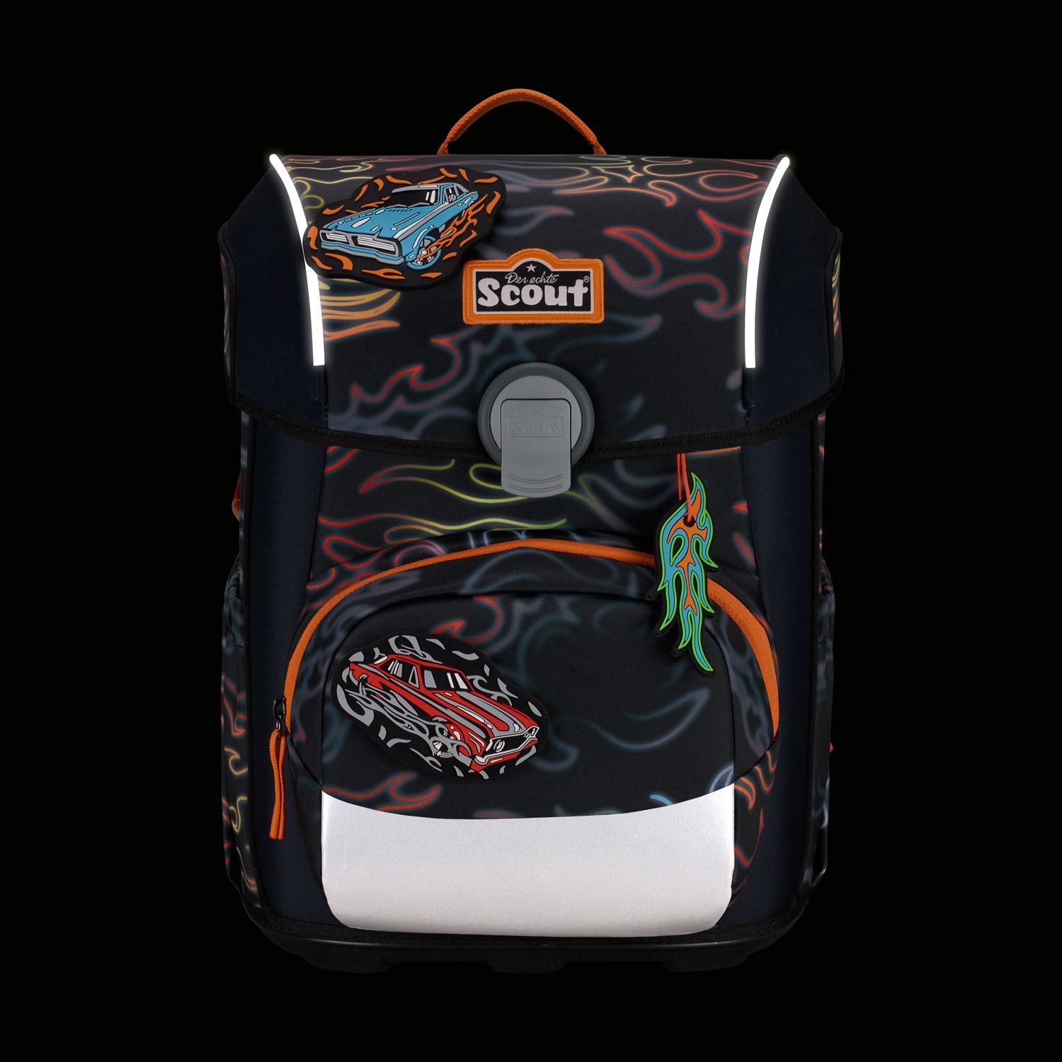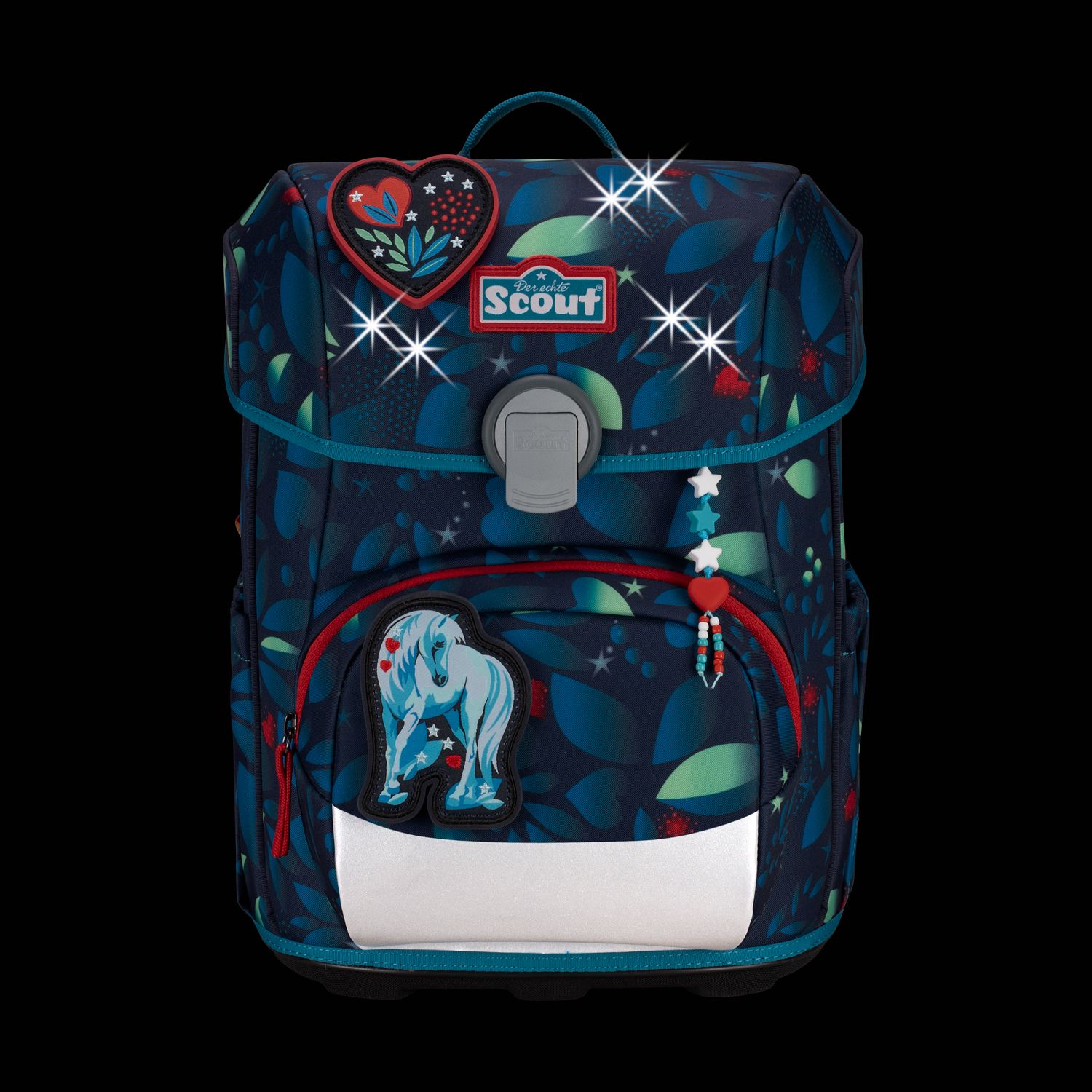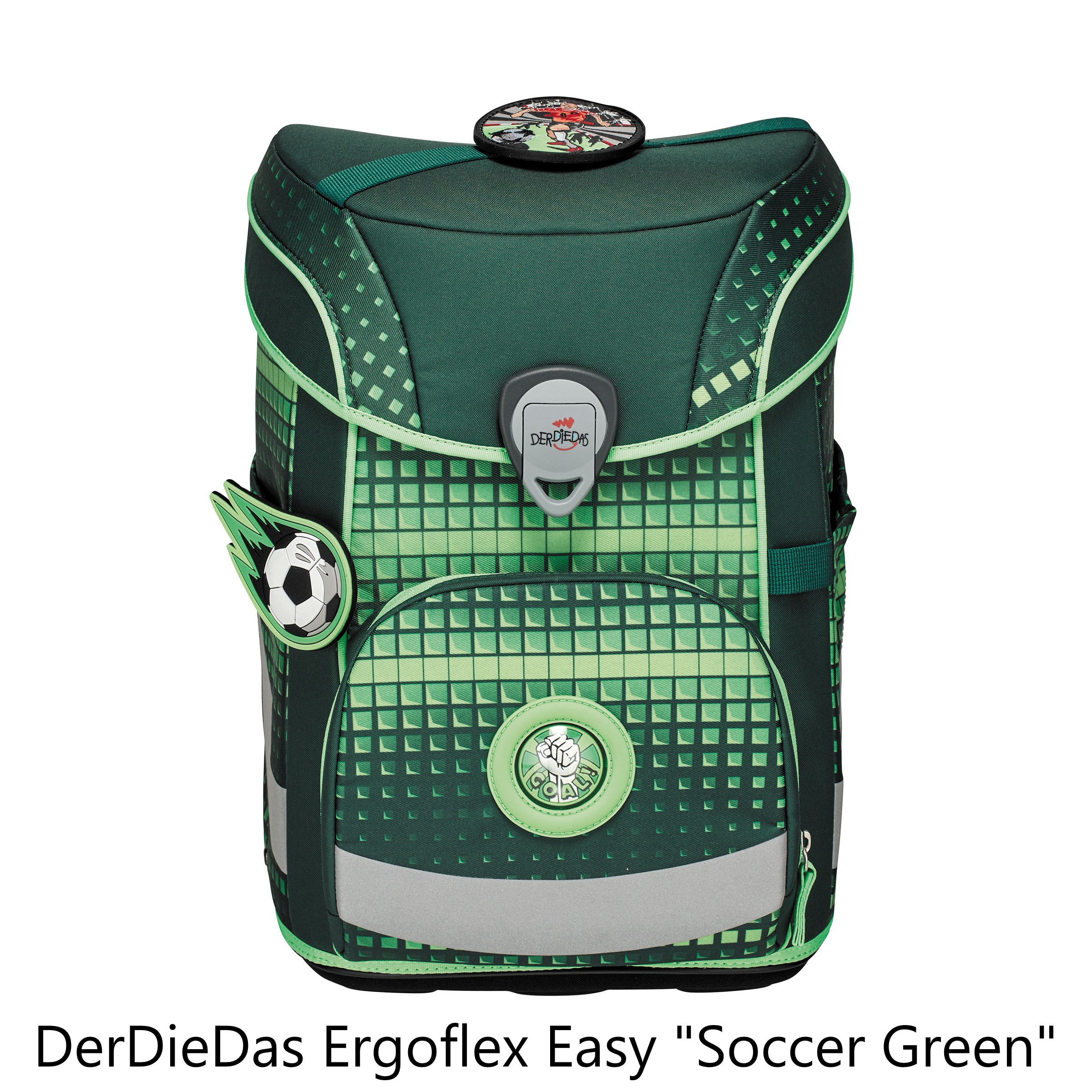 Der smarte Allrounder. Durchdachte Konstruktion mit schlanker Form. Flacher Deckel für viel Bewegungsfreiheit. Große Vordertasche für jede Menge Stauraum. Geräumige, dehnbare Seitentaschen. Auf dem Weg zur Schule ist Sicherheit das A und O. Farbenfrohe Designs ziehen bei Tageslicht die Blicke auf sich. Dank retroreflektierender und fluoreszierender Flächen nach DIN-Norm 58124 sind Schulkinder aber auch in der Dämmerung und bei Dunkelheit kaum zu übersehen.Maße:ca. 30 x 38 x 27 cm, Gewicht:ca. 1250 Gramm, Volumen:ca. 21,5 Liter Volumen, Schulranzen-Set 4-teilig bestehend aus: Schulranzen, Sportbeutel, Federmäppchen mit Staedtler Qualitätsbuntstiften, Schlamperetui.